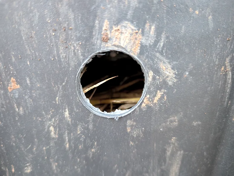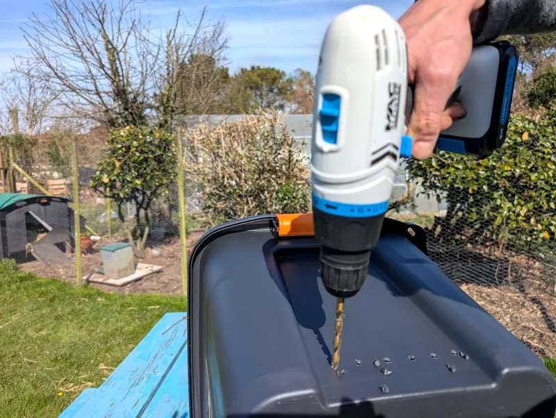 Optionally drill holes at the top. I did this where the lid overlaps the side of the bin, as I’ve been worried about rain getting in. This will allow flies in, but I wanted to ensure maximum aeration.