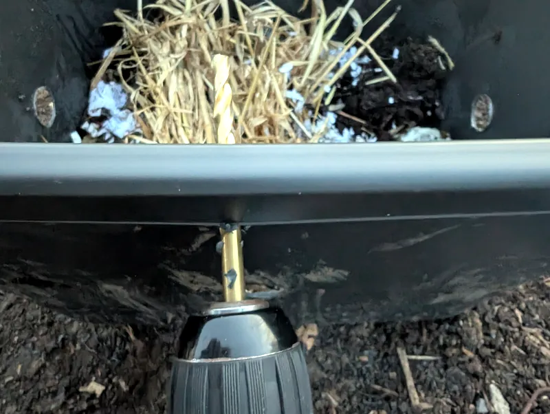 Drill a series of holes all around the sides of the bin using a ¼ inch drill bit. Place these just above the base to ensure they are covered by soil.